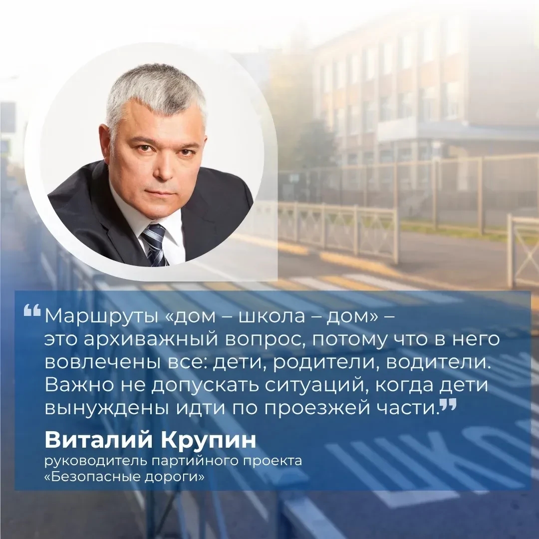 «Маршруты «дом – школа – дом» – это архиважный вопрос, потому что в него вовлечены все: дети, родители, водители. Важно не допускать ситуаций, когда дети вынуждены идти по проезжей части», – отмечает руководитель проекта «Безопасные дороги» «Единой России» Виталий Крупин.