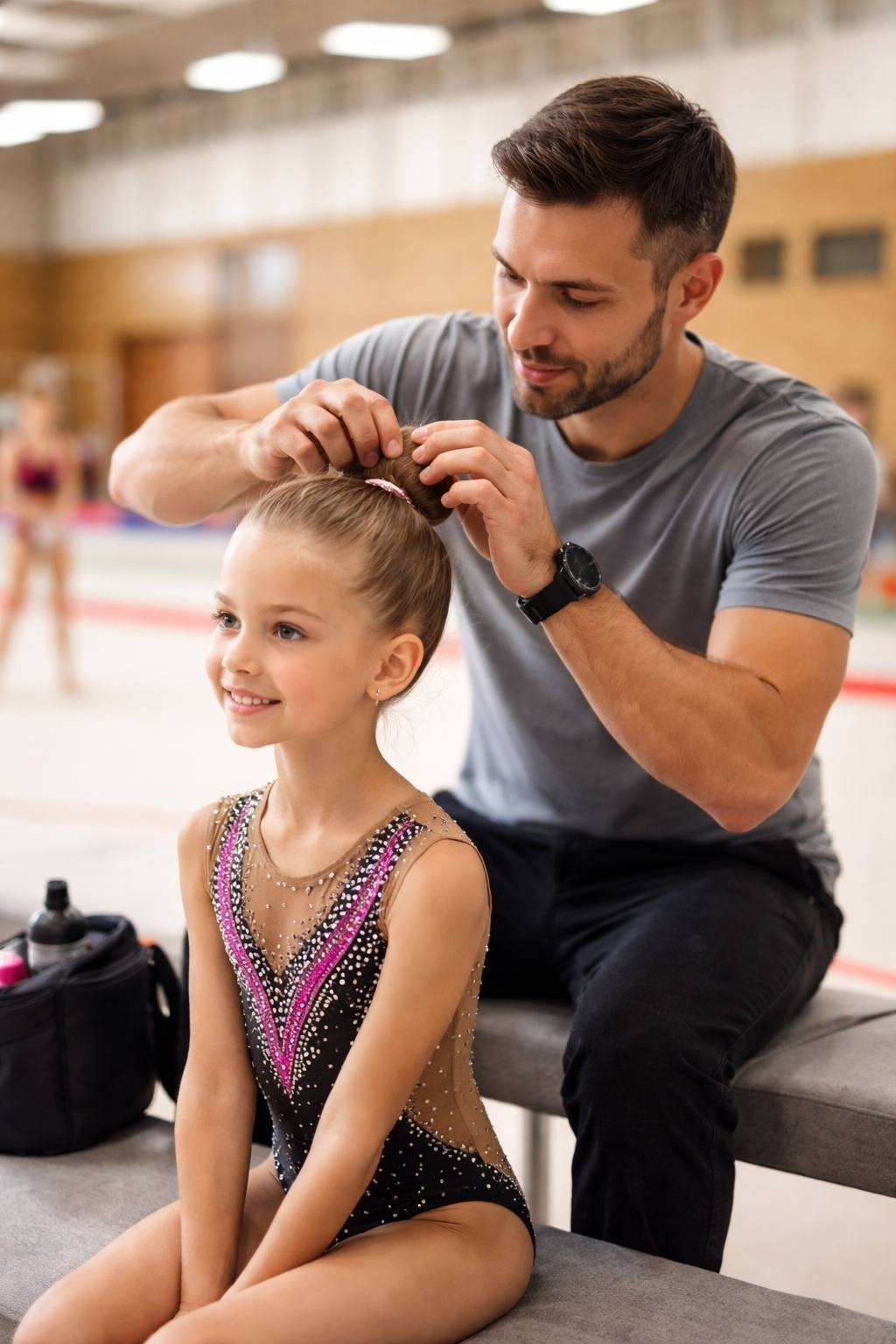 В этом виде спорта распущенные волосы запрещены — они мешают и могут привести к травмам. Поэтому на голове должен быть гладкий, крепко зафиксированный пучок. Для этого нам понадобится расческа, тугая резинка, валик, шпильки и невидимки, сеточка, лак или гель