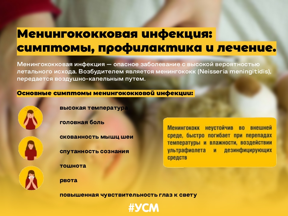 Менингококковая инфекция- это острое инфекционное заболевание, которое поражает слизистые оболочки носа и горла, а также мозговые оболочки. Основные симптомы включают высокую температуру, головную боль , тошноту и рвоту , сыпь на коже.
