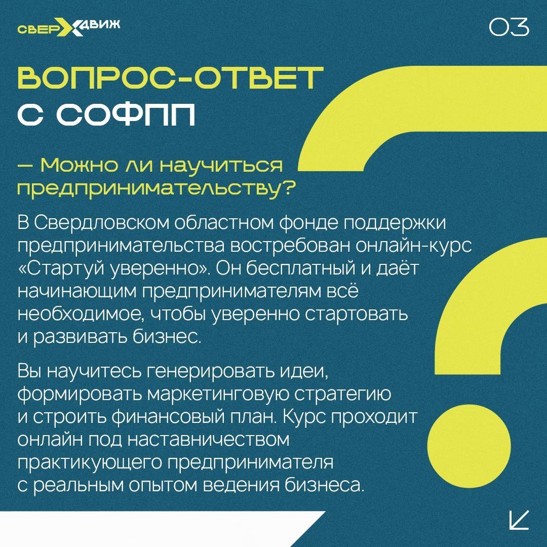 В рамках проекта «СВЕР × ДВИЖ» мы обратились с этими вопросами к Свердловскому фонду поддержки предпринимательства. Листайте карточки