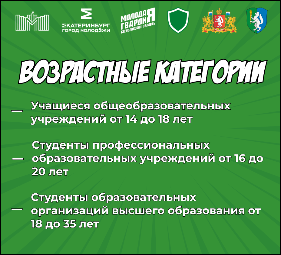 Принять участие могут Учащиеся общеобразовательных организаций в возрасте от 14 до 18 лет; Студенты профессиональных образовательных организаций в возрасте от 16 до 20 лет; Студенты образовательных организаций высшего образования (далее – вузов) в возрасте от 18 до 35 лет.
