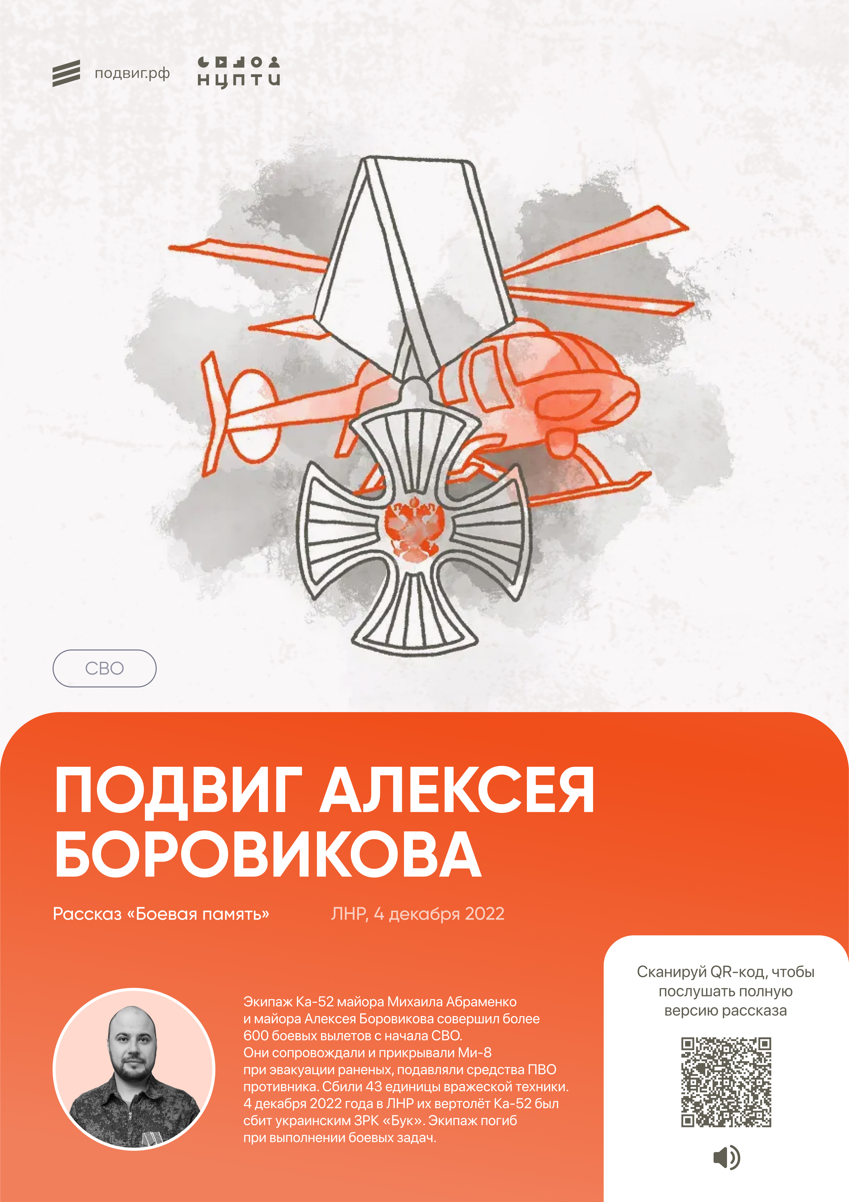 «Подвиг.РФ» посвящен сохранению исторического наследия нашей страны путем создания мультимедийных материалов, рассказывающих о героизме россиян — военных, сотрудников специальных служб и простых граждан. Проект представлен в разных форматах: рассказы, иллюстрации, аудиозаписи и видеоролики.