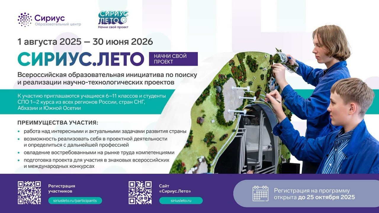Если ты ученик 6-11 класса, регистрируйся на «Сириус. Лето» до 25 октября.