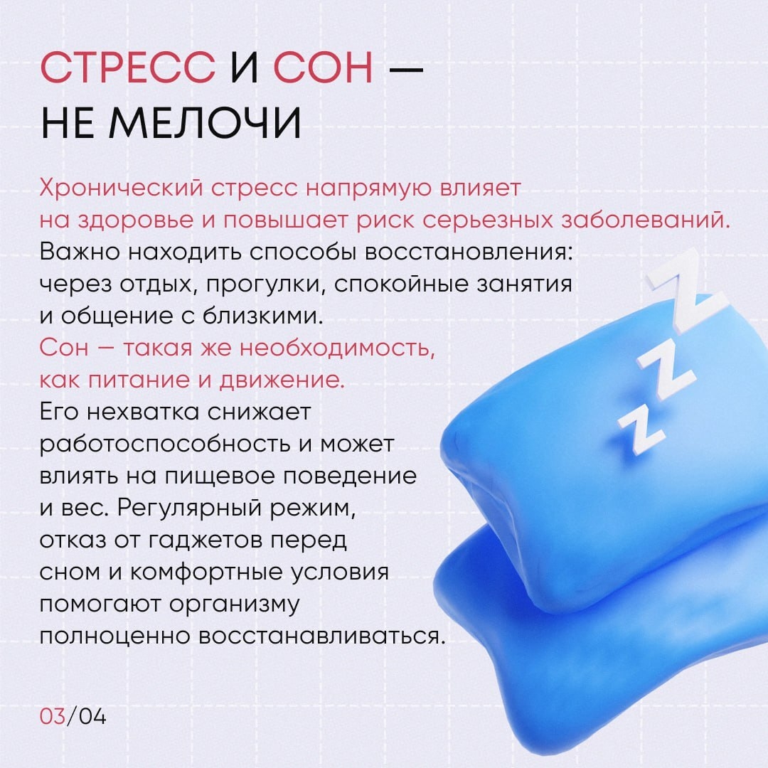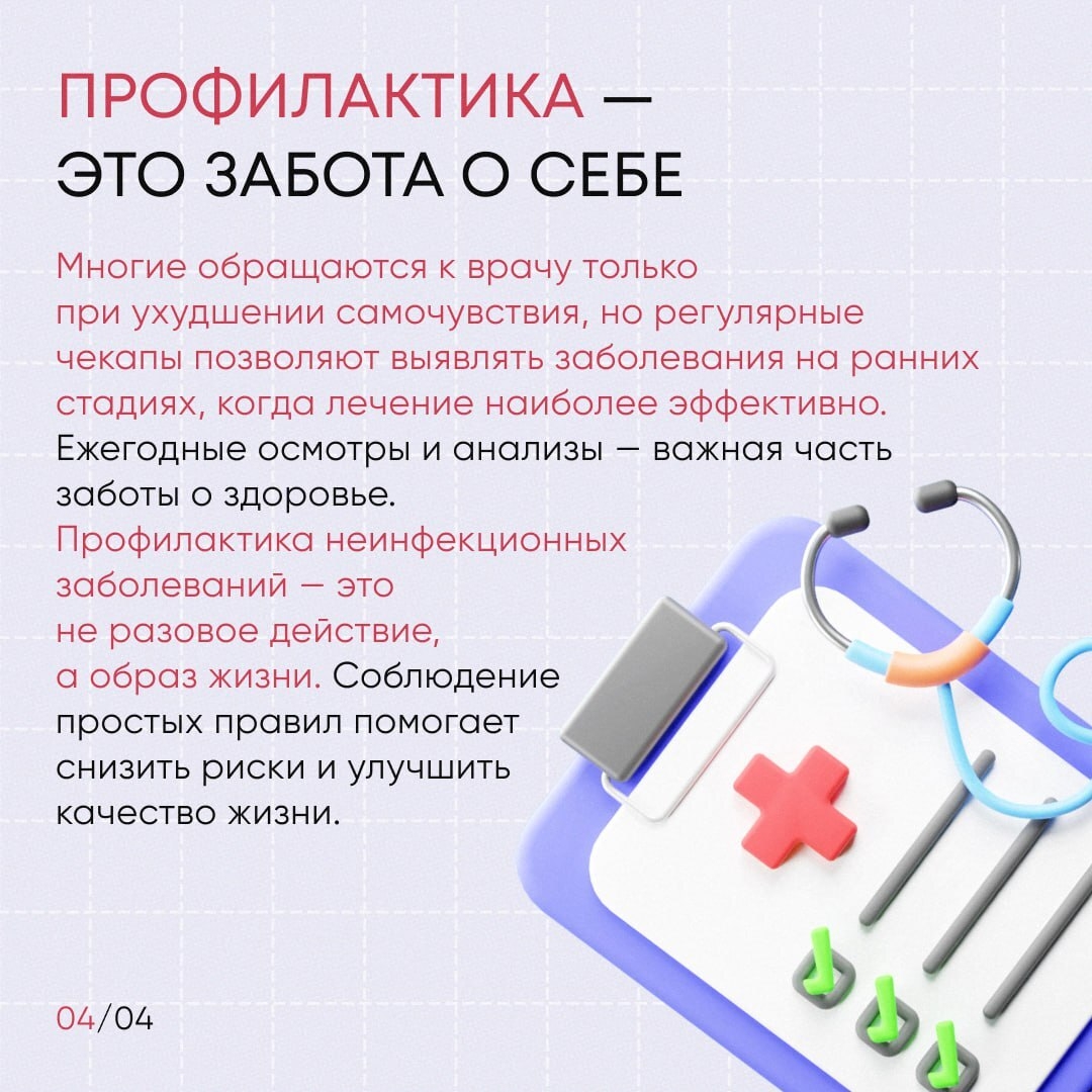На этой неделе особое внимание уделяется профилактике неинфекционных заболеваний — тому, что напрямую зависит от образа жизни и ежедневных привычек. Это повод остановиться и посмотреть на свое здоровье внимательнее: как мы двигаемся, отдыхаем, питаемся и заботимся о себе.